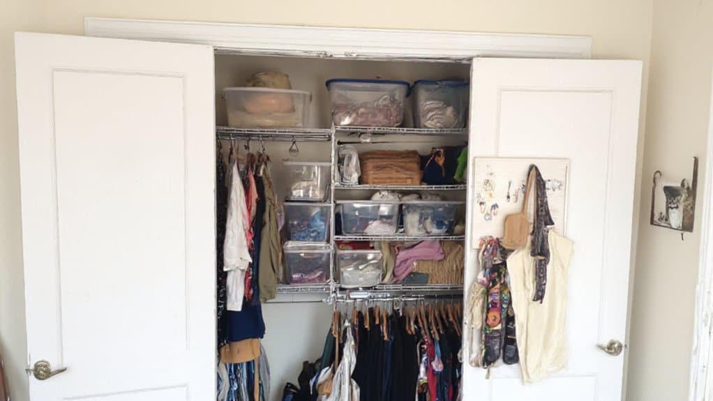 Think sliding door closets are too tricky to organize without wasted space? Think again! I’ve tackled my own cramped 6-foot-wide closet, and I’m thrilled to share easy hacks with you. Start by eyeing that empty vertical space—trust me, it’s a game-changer! Back in the day, I stacked bins up to 5 feet high, and wow, the difference! Curious how to transform yours? Stick around for more clever tips!
