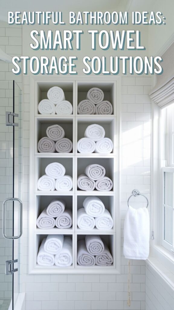 For optimal organization, assign specific shelves for different types of towels (bath towels, hand towels, washcloths) and consider adding small hooks between shelves for additional hanging options. Roll towels instead of folding them to maximize space and create a luxurious display.