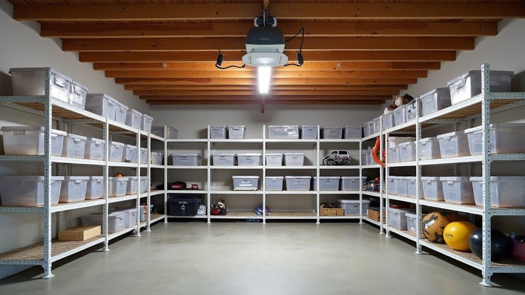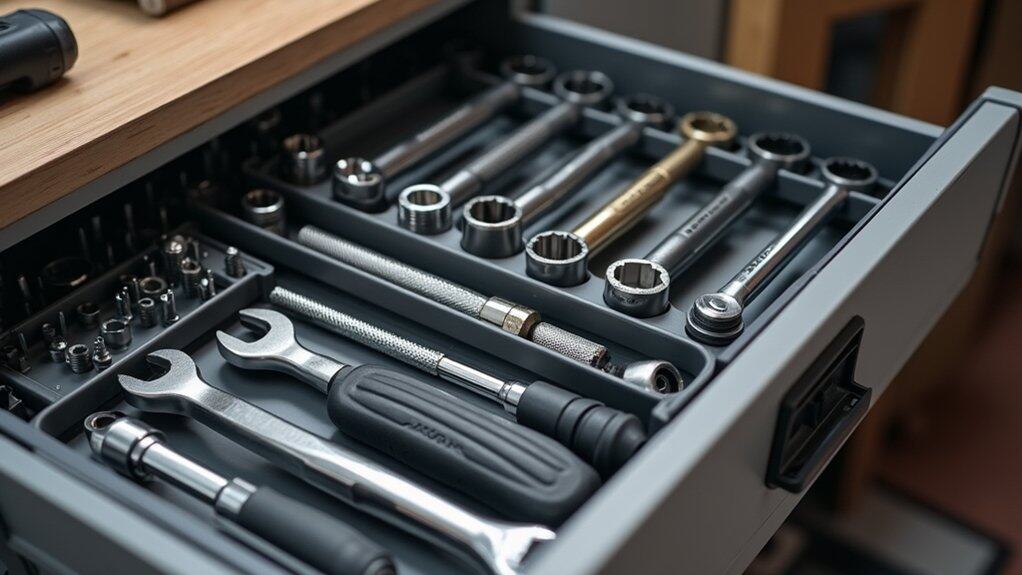 Labeled tool bins are an effective way to keep your garage workspace tidy and guarantee quick access to your tools. Start by sorting your tools into categories, such as screwdrivers, wrenches, and fasteners, and designate a bin for each group. Use clear plastic bins or sturdy containers to make contents visible, and label each bin clearly with a permanent marker or printed labels for easy identification.