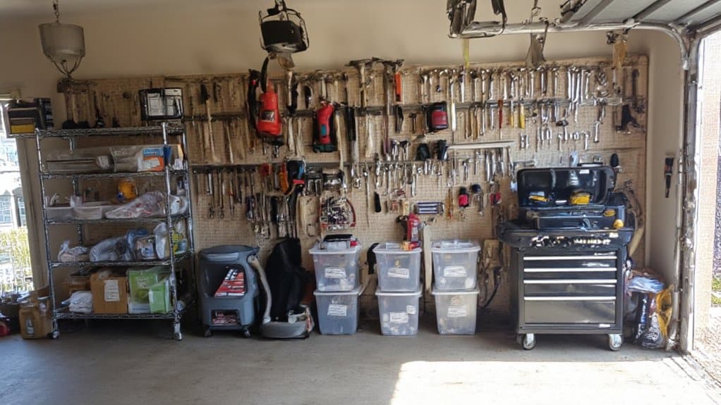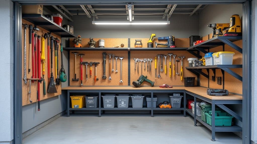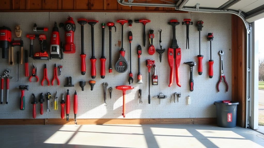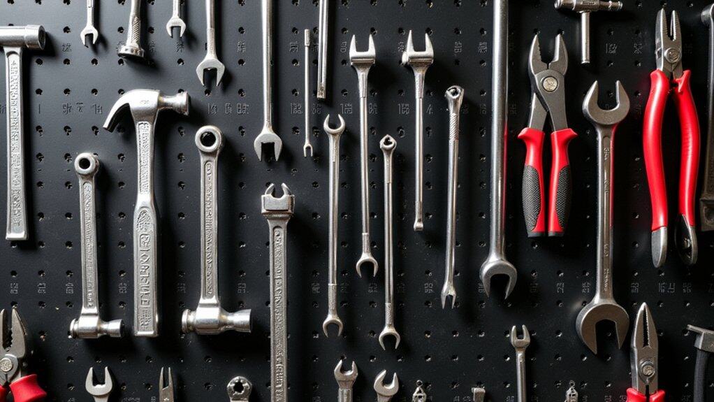 Pegboard storage systems are an incredibly versatile and efficient way to organize tools in a garage. Start by selecting a sturdy pegboard panel that fits your available wall space, guaranteeing it’s made of durable material like metal or heavy-duty plastic to support the weight of your tools. Mount the pegboard securely to the wall using a frame or spacers to allow hooks to be inserted easily, and guarantee it’s level to prevent tools from falling off.