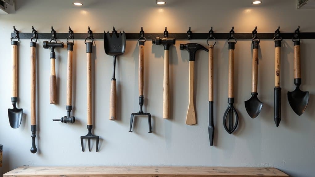 Wall-mounted tool hooks are an excellent solution for keeping tools accessible and off the floor in a garage. Begin by evaluating the tools you frequently use, such as hammers, screwdrivers, or garden tools, and determine the best wall space for mounting hooks near your workbench or storage area. Choose heavy-duty hooks that can support the weight of your tools and guarantee they are securely fastened to studs or with wall anchors for stability.