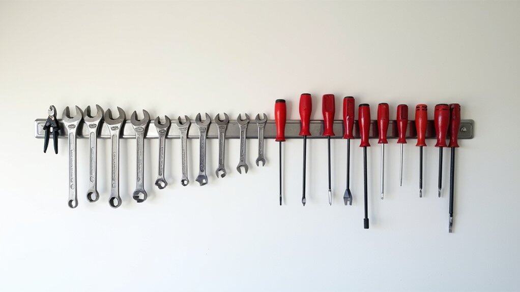 Magnetic tool strips are a highly effective solution for keeping frequently used tools accessible and organized in a garage. These strips, typically mounted on walls or inside cabinets, use strong magnets to securely hold metal tools like screwdrivers, wrenches, and pliers. To begin organizing, choose a location that is within easy reach and near your primary workspace to minimize movement while working on projects.