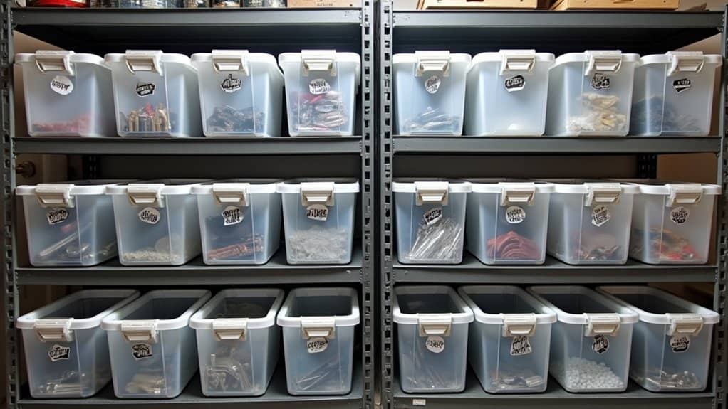 To maintain organization, place the bins on accessible shelves or in a rolling cart for portability, confirming frequently used tools are within reach. Regularly review the contents of each bin to remove unnecessary items or reorganize as your tool collection grows. This system not only saves time when searching for tools but also helps prevent clutter from accumulating in your garage.
