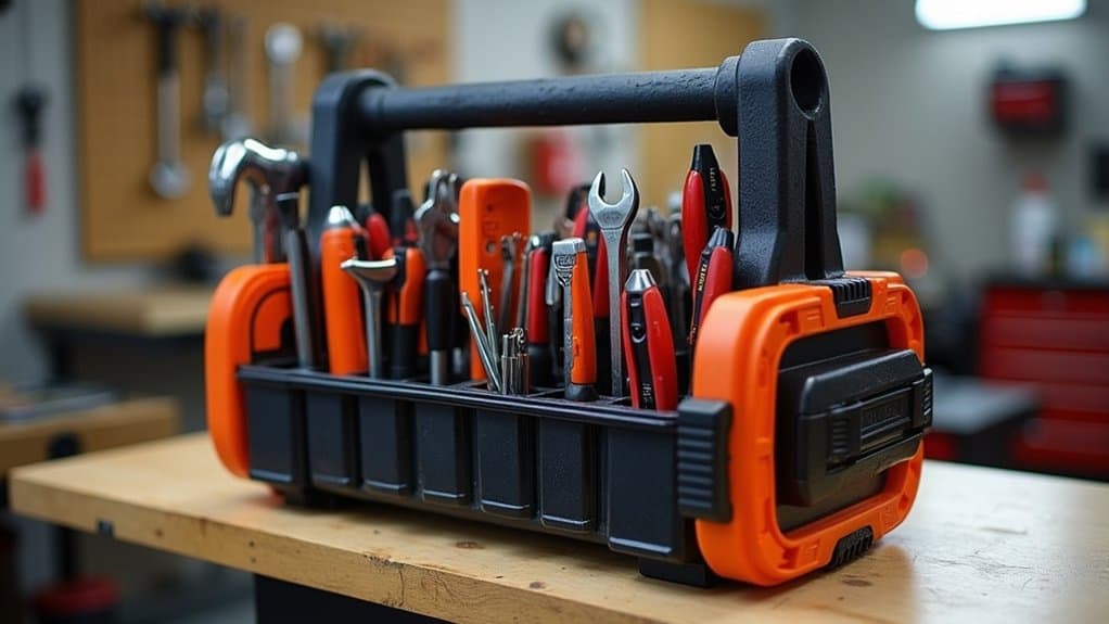 To organize the caddy effectively, place the most frequently used tools in the most accessible spots, like the top tray or front compartments, for quick retrieval. Group similar tools together, such as fasteners or measuring tools, in designated sections to avoid clutter and save time searching. Regularly clean out the caddy, removing unnecessary items or debris, to maintain order and confirm it remains a practical storage solution.
