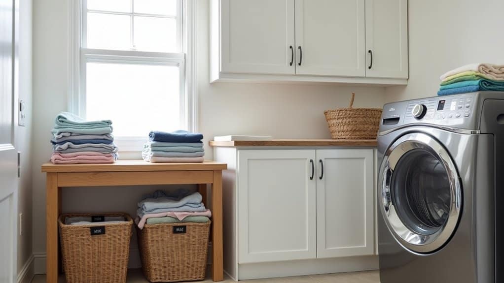 To make this process efficient, set up a clean, flat surface near the dryer for folding, such as a counter or table. Keep storage bins or baskets labeled for different clothing categories or family members to streamline sorting. Consistency is key—folding immediately guarantees clothes are ready to be put away, maintaining order in your laundry room.