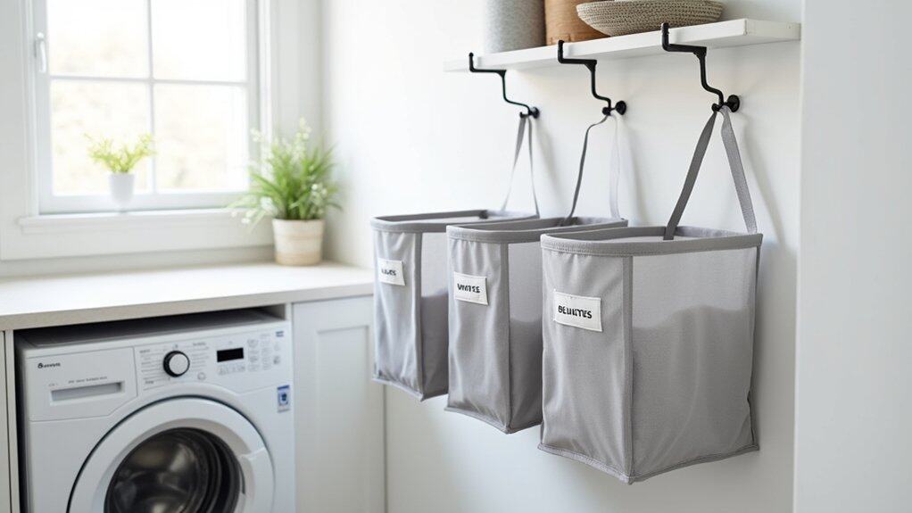 To set up, install a sturdy hanging system or over-the-door hooks that can support the weight of full hampers. Label each hamper or bag clearly to guarantee everyone in the household knows where to toss their clothes. This system not only keeps the laundry area tidy but also cuts down on the time spent sorting before washing.