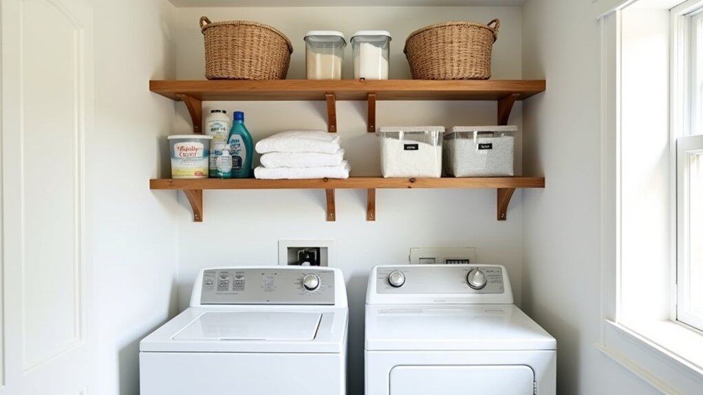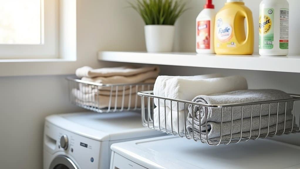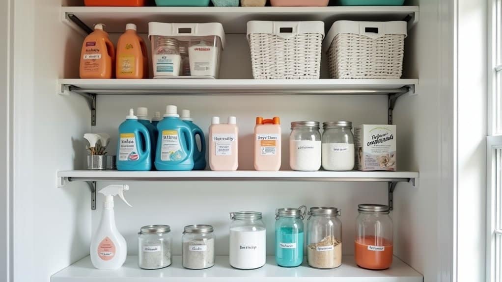 Next, categorize your laundry supplies by type or frequency of use, placing the most-used items like detergent at eye level for easy access. Use labeled bins, baskets, or clear containers to group smaller items like stain removers or dryer sheets, preventing them from getting lost or creating clutter. Finally, consider installing shelf dividers or small organizers to maintain separation between categories and guarantee the shelves stay tidy over time.