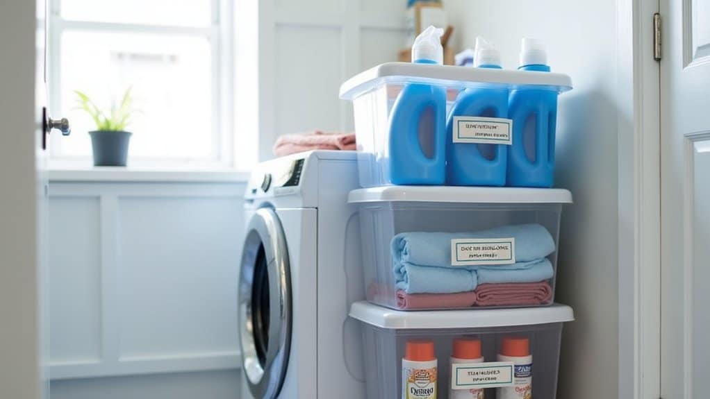 To set up, start by categorizing your laundry supplies into groups, such as washing essentials, stain removers, and dryer sheets, before placing them into designated bins. Stack the bins securely on a shelf or directly on the floor near your washer and dryer for convenience. Confirm the stack is stable by using bins with interlocking designs or adding non-slip pads between layers to prevent tipping.
