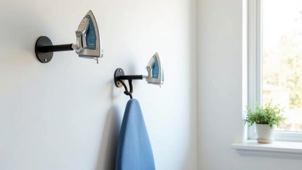 Mounting ironing board hooks is a practical way to keep your laundry room organized and free up floor space. Start by selecting a sturdy hook or bracket system that can support the weight of your ironing board, guaranteeing it is designed for wall mounting. Choose a convenient location on the wall, ideally near your ironing area, and use a stud finder to locate a secure spot for installation.
