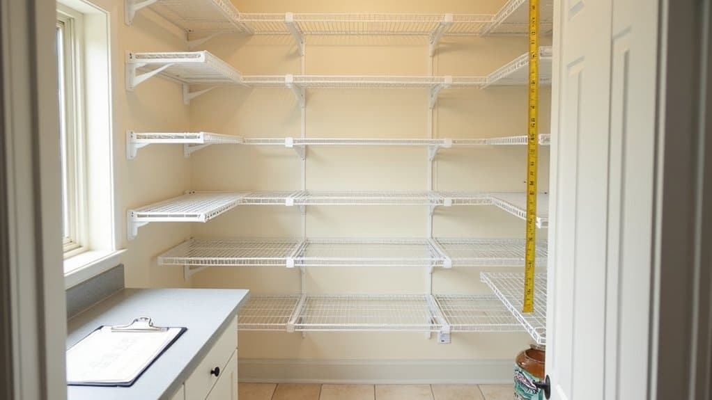 Optimizing shelf spacing in your pantry is a key step to maximizing storage and improving accessibility. Start by evaluating the height of the items you store most frequently, such as cereal boxes, canned goods, or spice jars, and adjust the shelves to accommodate these items with minimal wasted space. If your pantry has adjustable shelves, move them up or down to create custom heights, guaranteeing taller items aren’t cramped and smaller items aren’t lost in oversized gaps. Consider grouping similar items together on shelves that fit their dimensions, like placing bulk goods on deeper or taller shelves while keeping snacks on shorter ones for easy reach.