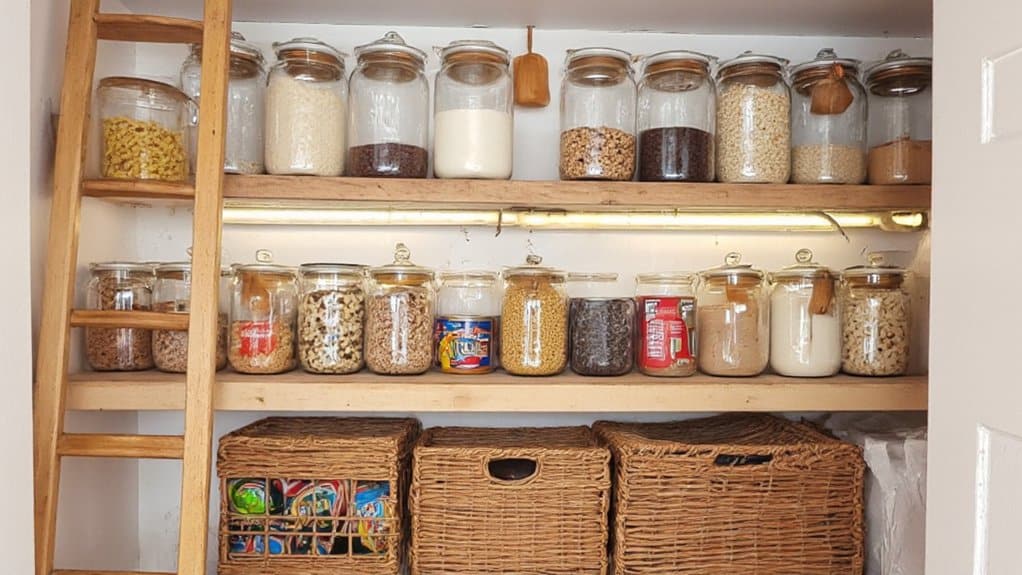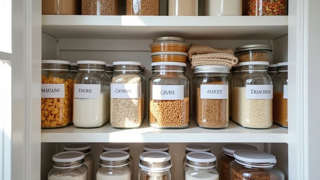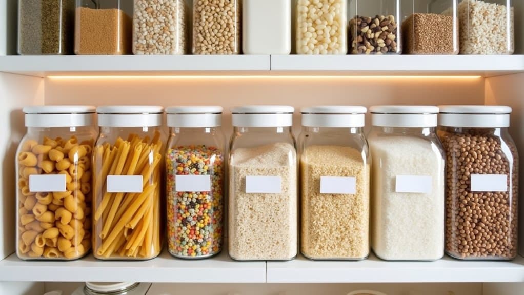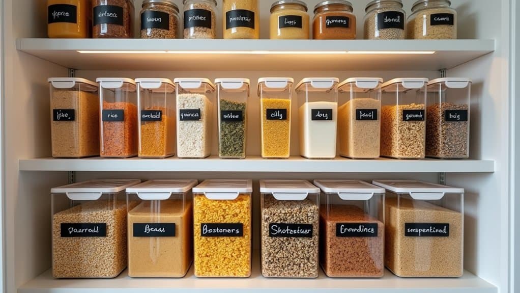 When selecting containers, consider materials like glass or BPA-free plastic for durability and safety, ensuring they are easy to clean. Label each container with its contents and expiration dates using a label maker or chalkboard stickers for quick identification. Place frequently used items at eye level and less-used ones higher up or in deeper storage. This system not only streamlines meal prep but also helps prevent overbuying by making inventory visible.