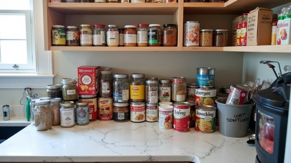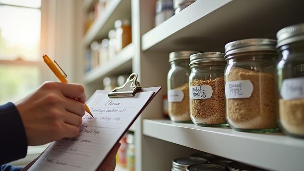 Maintaining order in your pantry through routine checks is essential to prevent clutter and guarantee everything remains accessible and fresh. Start by scheduling a specific time each week or month to review your pantry contents, depending on how often you use it. During these checks, inspect items for expiration dates, removing anything that’s outdated or spoiled to avoid health risks and wasted space. Also, take note of items that are running low and add them to your shopping list to avoid last-minute shortages.