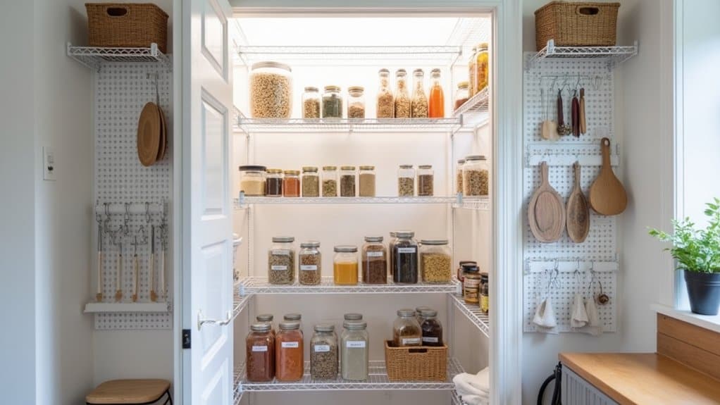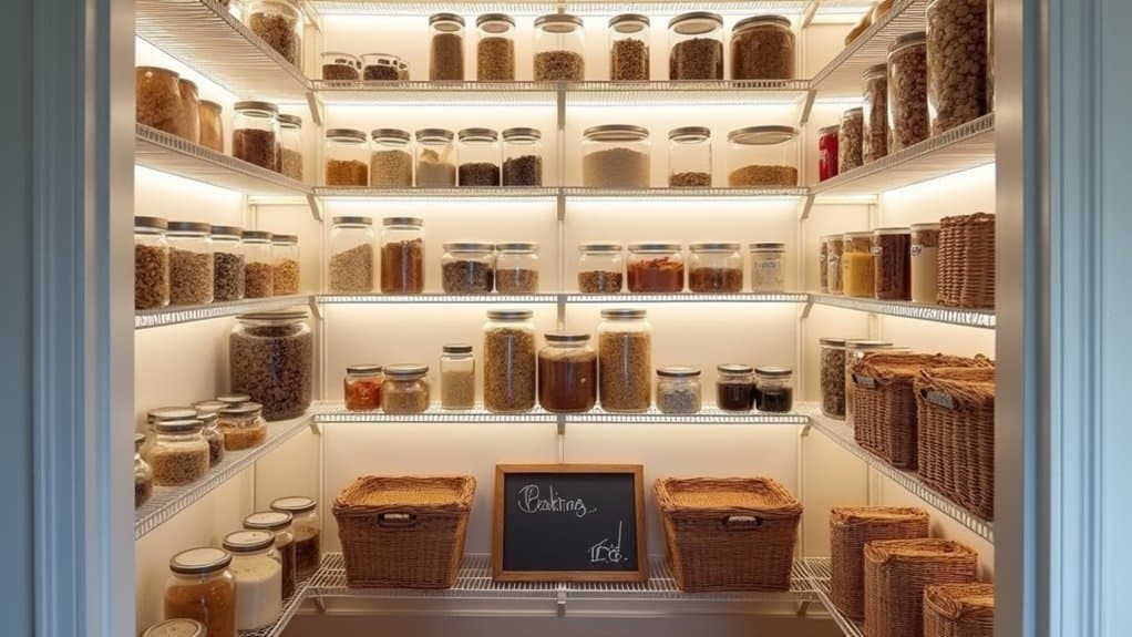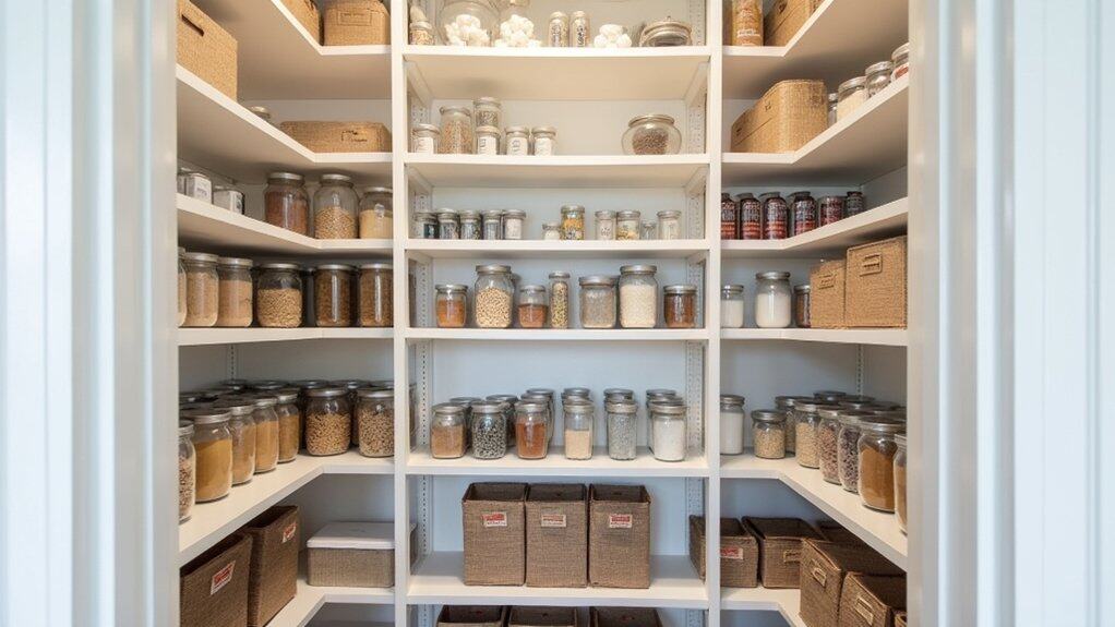 Next, empty everything out of your pantry to get a clear view of the space and evaluate its condition. Look for signs of wear, such as damaged shelves or areas prone to moisture, which could affect stored items like canned goods or dry foods. Consider the accessibility of different zones—place frequently used items at eye level and less-used items higher or lower. Use this opportunity to clean the space thoroughly, wiping down shelves and vacuuming corners to guarantee a fresh start. This step sets the foundation for creating a functional and efficient pantry layout tailored to your needs.