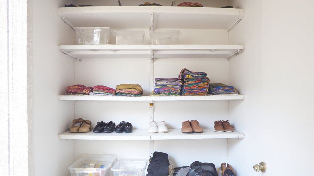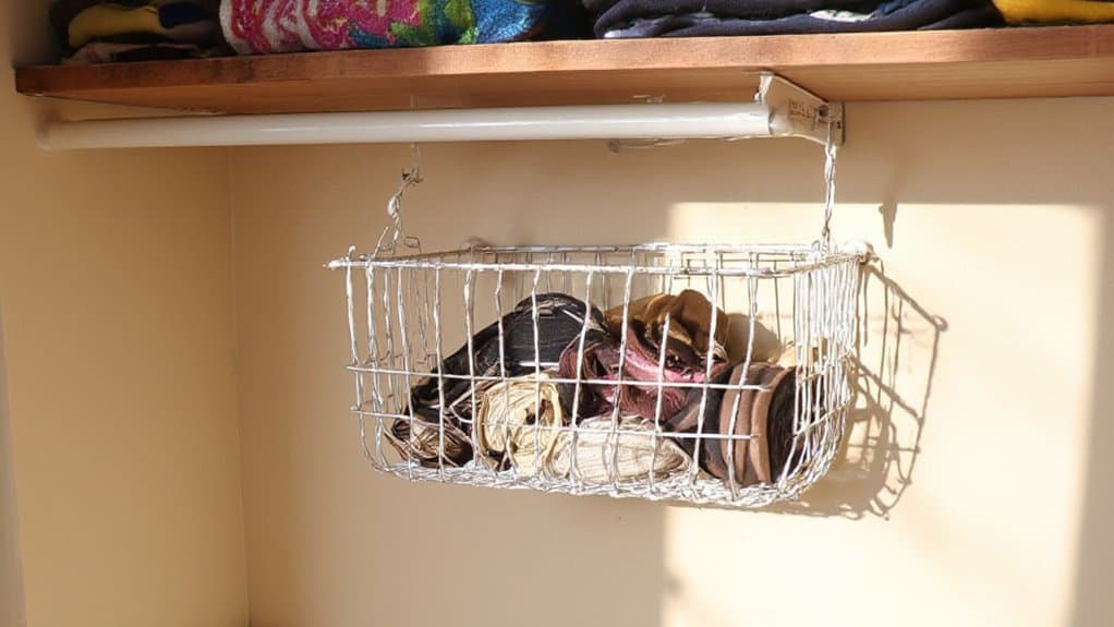 Under-shelf baskets are a fantastic way to maximize vertical space in your closet, especially for smaller items that can otherwise clutter shelves. Begin by measuring the space under your closet shelves to guarantee the baskets you choose will fit snugly without obstructing items below. Select baskets that slide onto the shelf or attach with hooks, making sure they are sturdy enough to hold items like scarves, belts, or folded clothing.