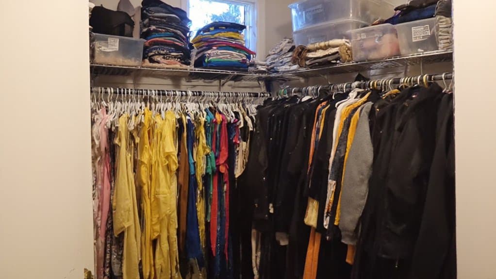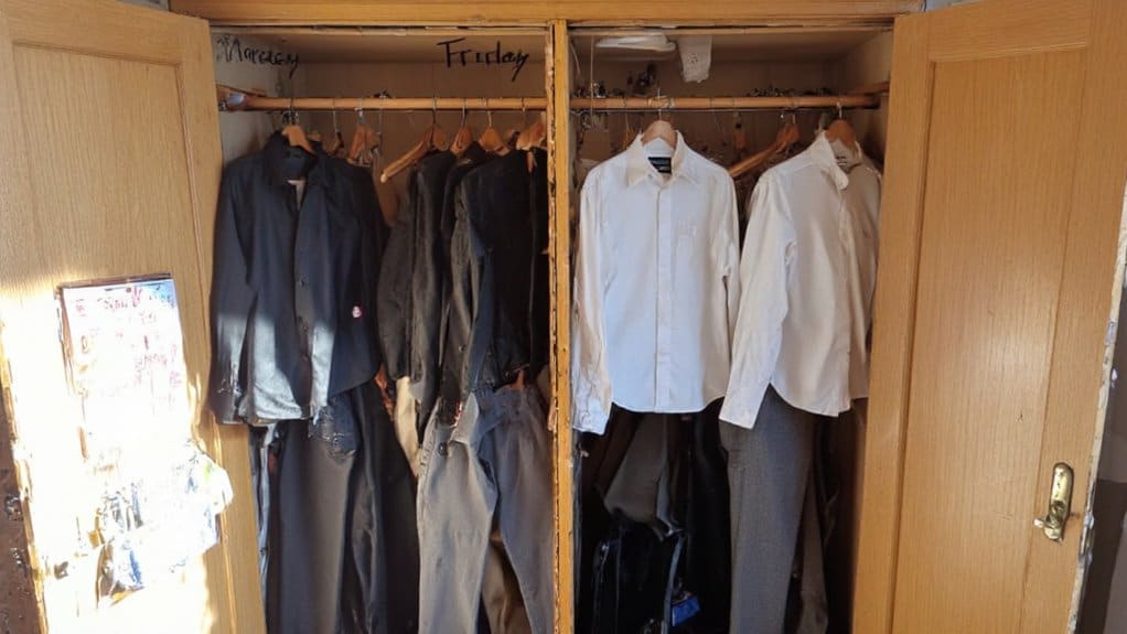 To maintain this system, review and rotate your outfits every weekend, returning worn items to their regular spots after laundering. Plan the next week’s ensembles, incorporating variety to avoid outfit fatigue and guarantee all pieces in your wardrobe get used. This method not only simplifies decision-making but also helps you rediscover forgotten clothing items.