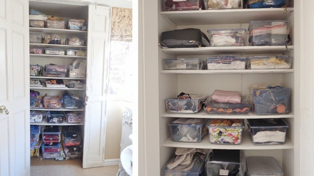 To keep the system effective, update the inventory list every time you add or remove items from a bin. Regularly review these lists, ideally during seasonal cleanouts, to guarantee they reflect the current contents and to declutter any unused items. This habit prevents mystery bins and saves time when searching for specific belongings in your closet.