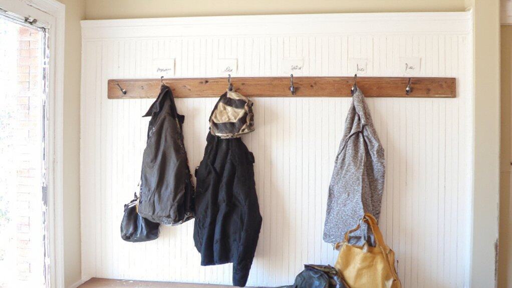 Labeling coat hooks is a simple yet effective way to maintain order in a coat closet. Assign specific hooks to family members or categories, such as “kids’ coats,” “guest coats,” or “everyday jackets,” to guarantee everyone knows where to hang their items. This prevents clutter and makes it easy to locate outerwear quickly, especially during busy mornings.