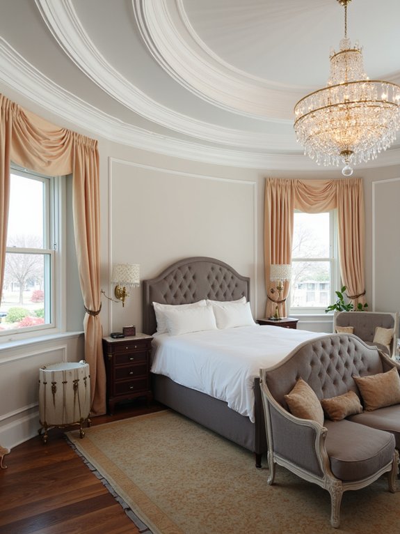 Curved crown molding adds sophisticated architectural detail where walls meet the ceiling, featuring graceful contours and decorative patterns that create an elegant transition between surfaces. These classic elements instantly elevate a room’s visual appeal while establishing timeless character.