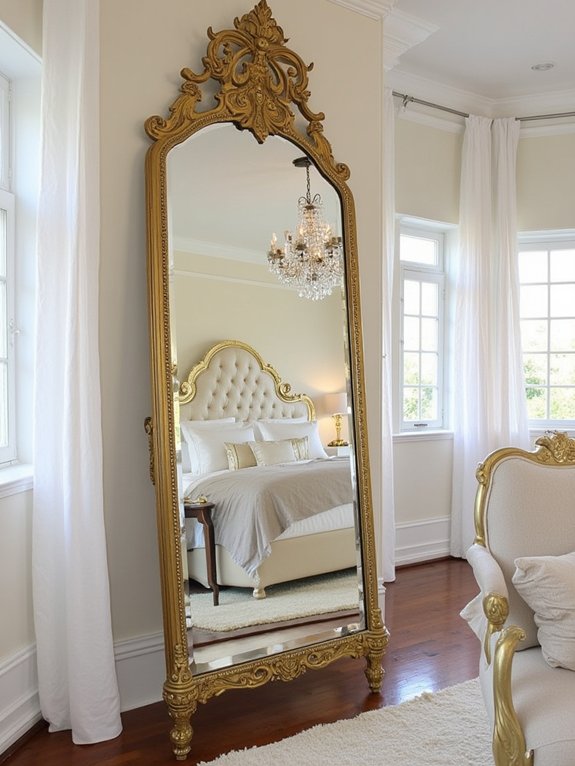 A gilded cheval floor mirror combines classic elegance with practical functionality. The ornate frame houses a full-length mirror that swivels for optimal viewing, creating an instant focal point in any bedroom while serving essential daily use.