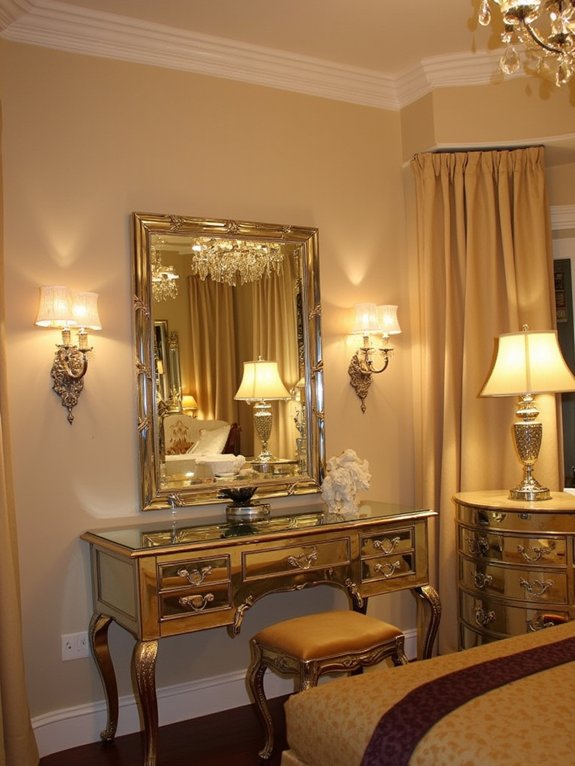 A mirrored vanity lighting fixture combines practicality with elegance in bedroom design. These fixtures provide essential illumination while serving as sophisticated decorative elements that enhance the room’s overall aesthetic. The mirrored components reflect and amplify light, creating an appealing ambiance.
