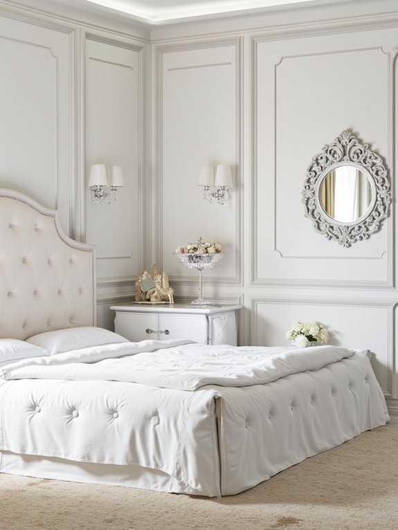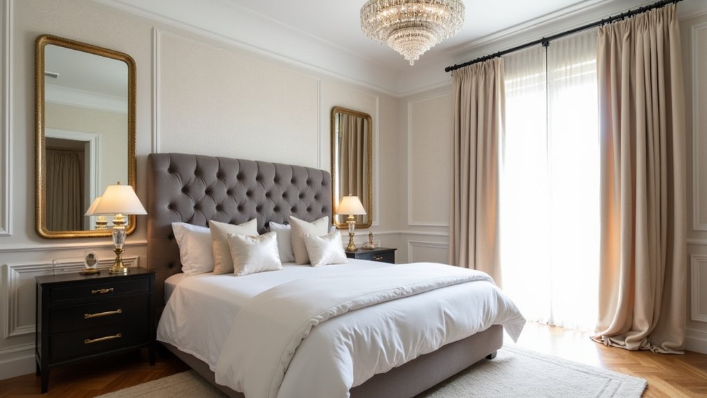 A crystal-trimmed vanity stool combines luxury and functionality, featuring delicate hand-applied crystal beading that adorns both its frame and upholstery. These elegant pieces come in various styles, including round tufted designs and square-cushioned options, making them versatile additions to any sophisticated bedroom dressing area.