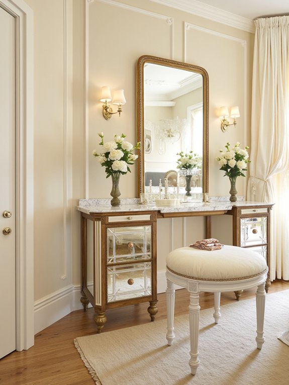 The stool’s customizable features include plush velvet or silk upholstery that complements the sparkling crystals, along with chrome, gold, or silver metallic frame finishes. Proper dimensions ensure comfortable seating, with heights ranging from 18-20 inches and recommended placement of 24 inches clearance beneath the vanity mirror.