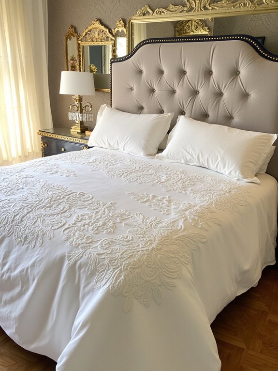 Each cover demonstrates meticulous attention to detail through double-hemmed edges, precise stitching, and optional custom monogramming in metallic or tonal threads. The heirloom quality of these pieces requires specialized care, including professional cleaning, to preserve their exceptional beauty and durability.