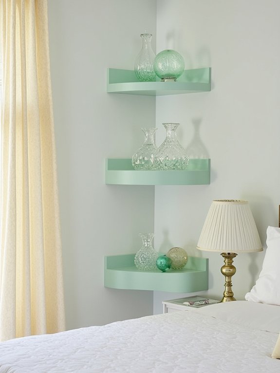 Create a serene bedroom display using floating shelves in sea-glass green, ranging from 24 to 36 inches in length. The shelves showcase an artful arrangement of sea glass vessels, natural elements like coral and driftwood, woven baskets, and metallic accents in brushed silver or aged brass.