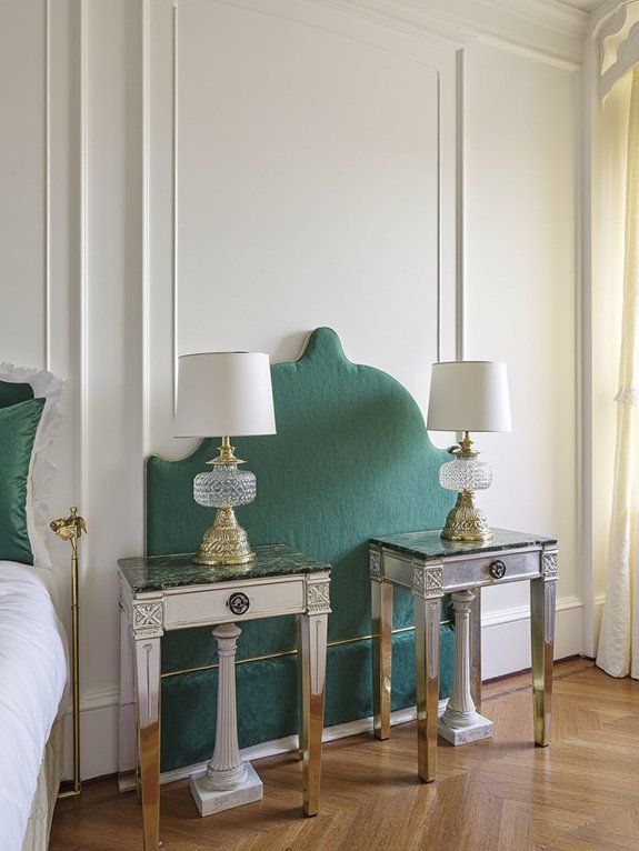 The transformative feature can be enhanced with gold-framed mirrors or artwork positioned against the wall, along with decorative malachite green accessories. When paired with brass or gold accents, this gemstone-inspired focal point elevates the bedroom’s sophistication while anchoring the overall design scheme.