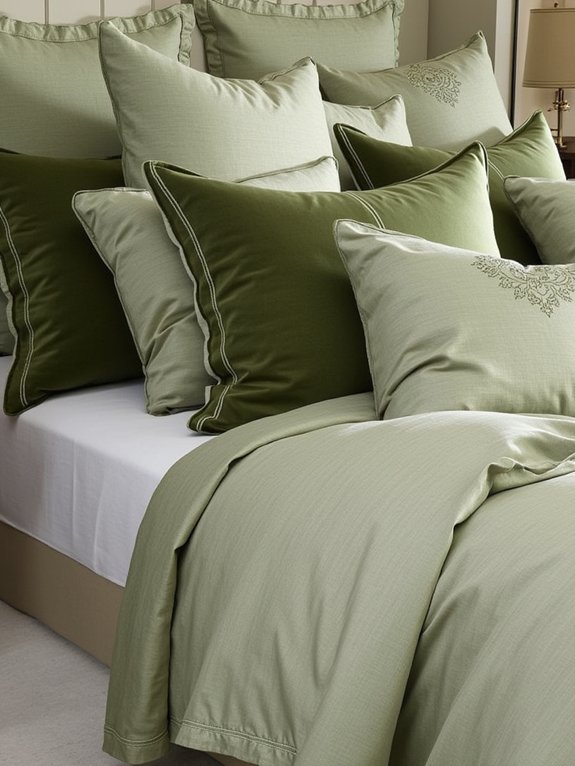 This thoughtful progression of sizes, materials, and green tones creates a sophisticated bedding display that elevates the entire room’s aesthetic while maintaining a cohesive natural palette. The varied textures and dimensions transform an ordinary bed into an inviting focal point.