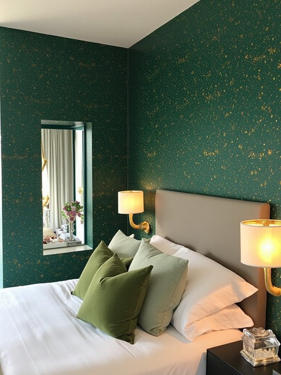 A malachite-green accent wall draws inspiration from the striking patterns of this natural gemstone to create dramatic visual impact in a bedroom. The rich, swirling textures characteristic of malachite translate beautifully into wall treatments using specialized paint techniques or geometric wallpaper in deep emerald tones.