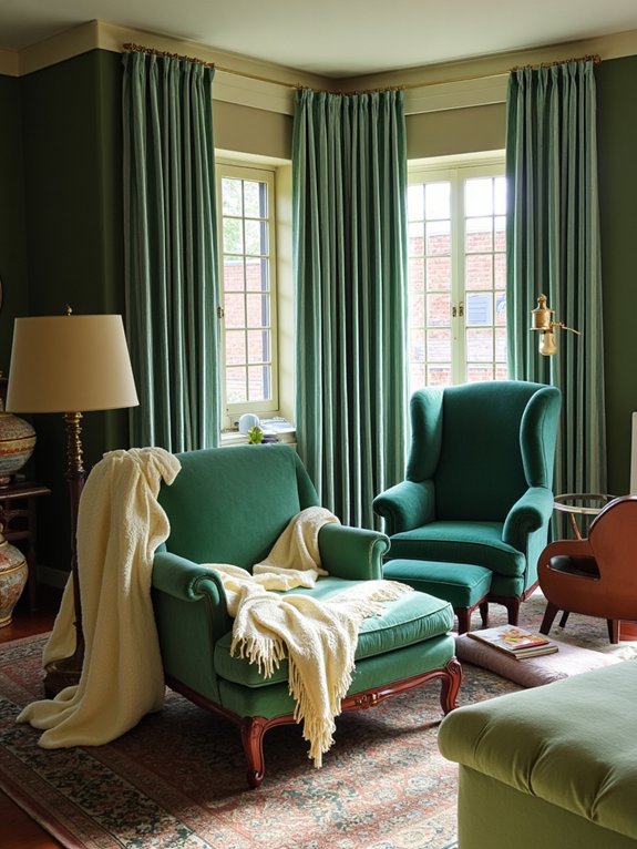 A plush velvet armchair in deep forest green anchors this sophisticated reading corner, creating an intimate space for literary indulgence. The chair is complemented by a brass floor lamp, mahogany side table, and sage green mohair throw blanket for optimal comfort and style.
