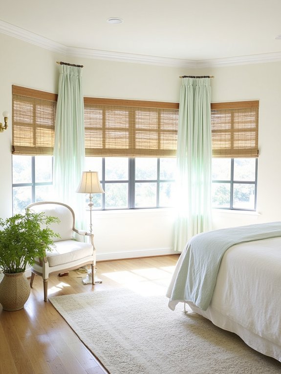 Sage-colored bamboo window shades combine natural elegance with practical functionality, offering a sustainable window treatment solution that enhances any room’s ambiance. The shades feature varying sage tones and natural bamboo textures that provide both aesthetic appeal and effective light control while complementing diverse interior styles.