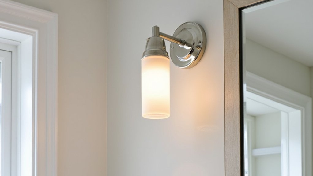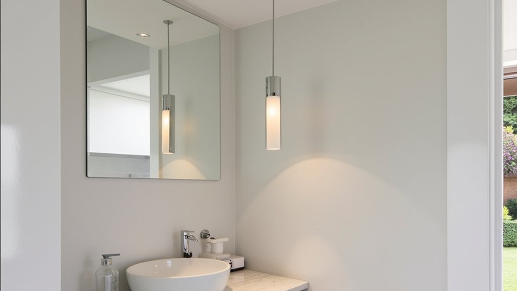 If you’re looking to add a modern touch to your small bathroom, consider installing a sleek pendant light. It’s a stylish choice that maximizes space while brightening your room. Hang it 30-36 inches above the sink for ideal light, taking about 2 hours to install with basic tools.