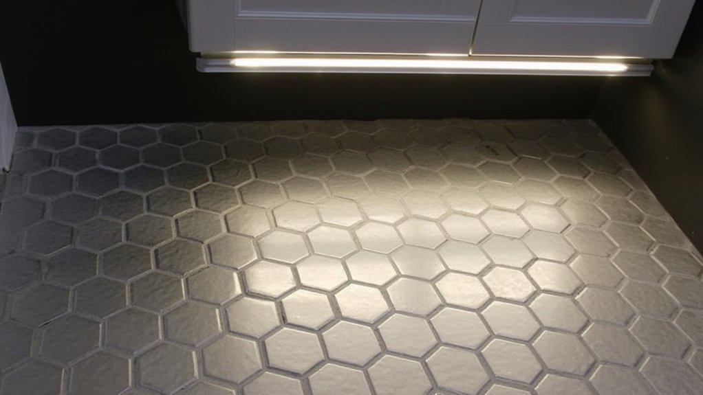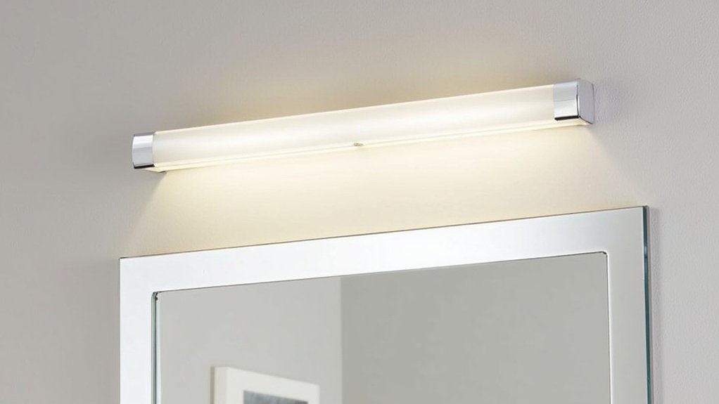 Several clever lighting options exist for small bathrooms, and unique under-cabinet lighting can truly transform your space. You’re not just adding light; you’re creating ambiance with a subtle glow beneath cabinets. Install strips or puck lights for a modern look, keeping your 24-inch vanity area clutter-free.
