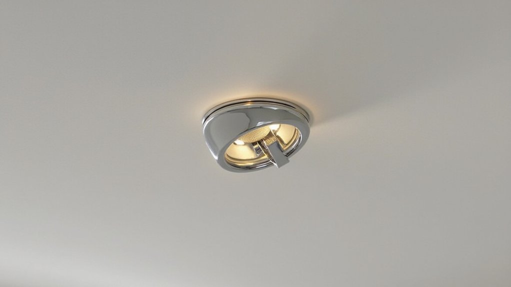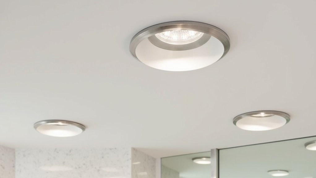 While modern flush mounts offer a sleek ceiling solution, you’ll find minimalist recessed lighting takes space-saving to the next level. You can install these lights directly into the ceiling, freeing up visual space in your small guest bathroom. They’re perfect for a clean, modern look without clutter.