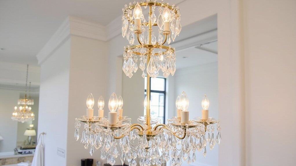 Elegance reigns supreme when you choose a crystal chandelier design for your powder room’s lighting. You’ll transform a small space into a luxurious nook with just one fixture. Hang a chandelier, sized about 18-24 inches in diameter, centrally over the sink for balanced light. It only takes 30-45 minutes to install with basic tools.