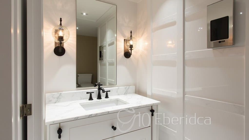How can you elevate your powder room with a modern touch? By installing sleek wall sconces, you’ll instantly add style and function. These fixtures save space and offer focused lighting, perfect for a small area.