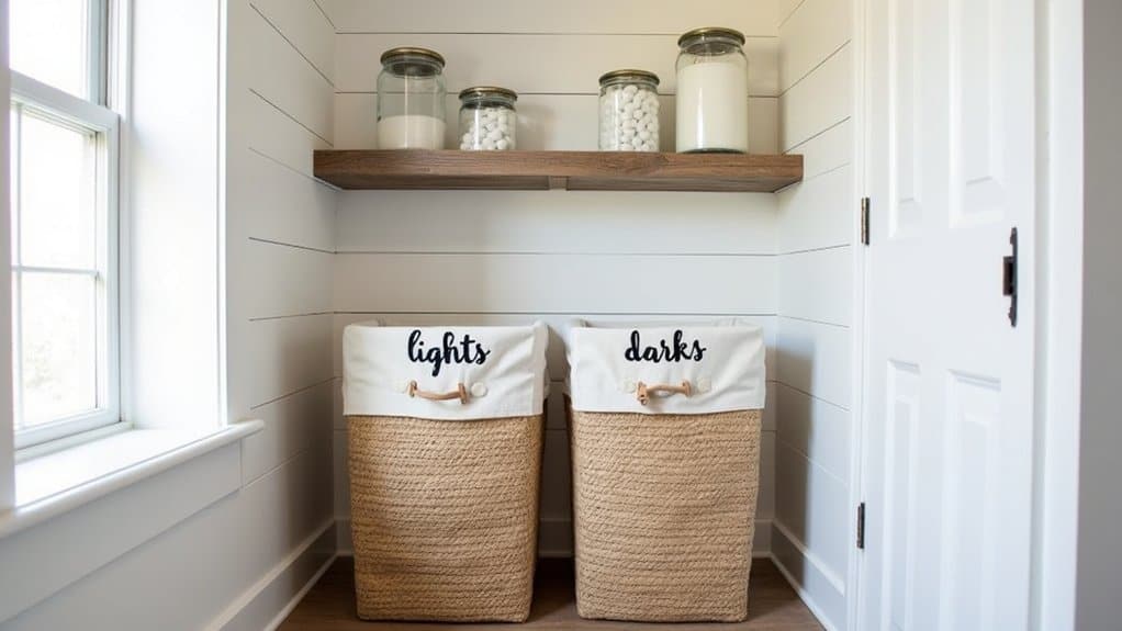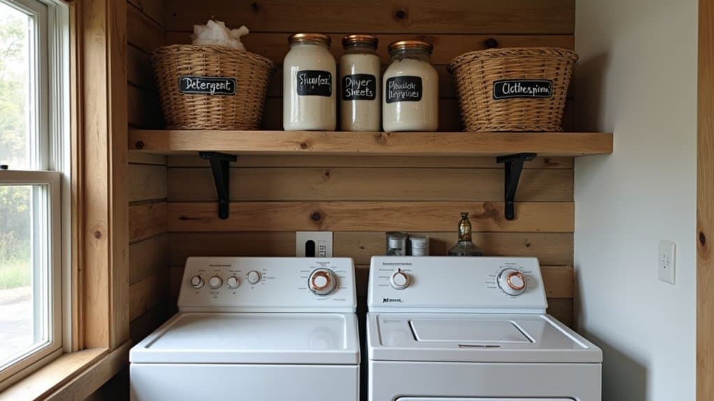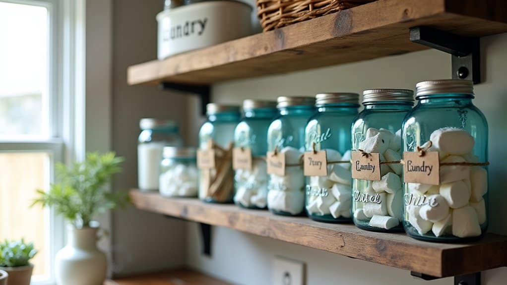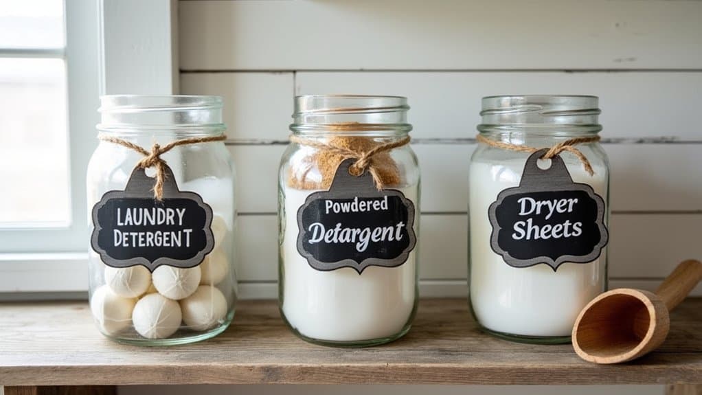 Mason jars offer a stylish and practical solution for organizing laundry detergent and other washing essentials. Start by selecting wide-mouth mason jars in various sizes to accommodate powdered detergent, pods, or fabric softener, making certain they are airtight to prevent moisture from affecting the contents. Label each jar clearly with chalkboard labels or printable tags for quick identification and a cohesive look.