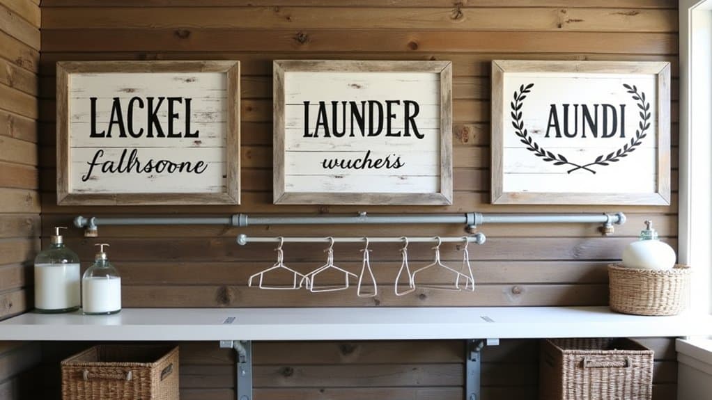 Farmhouse signage décor can add a charming, rustic touch to your laundry room while also serving a functional purpose in organization. Start by selecting or creating signs with clear, easy-to-read text that label key areas, such as “Laundry Supplies,” “Sorting Station,” or “Lost Socks.” Hang these signs above shelves, bins, or hooks using sturdy hardware to guarantee they stay in place and guide users to the right spots effortlessly.