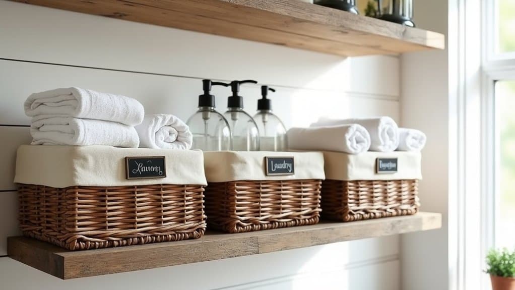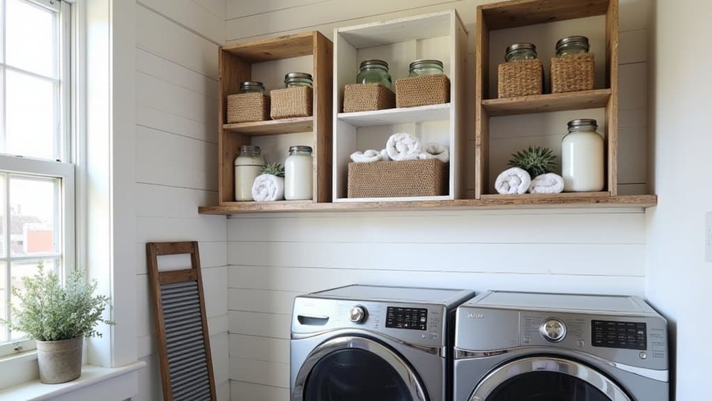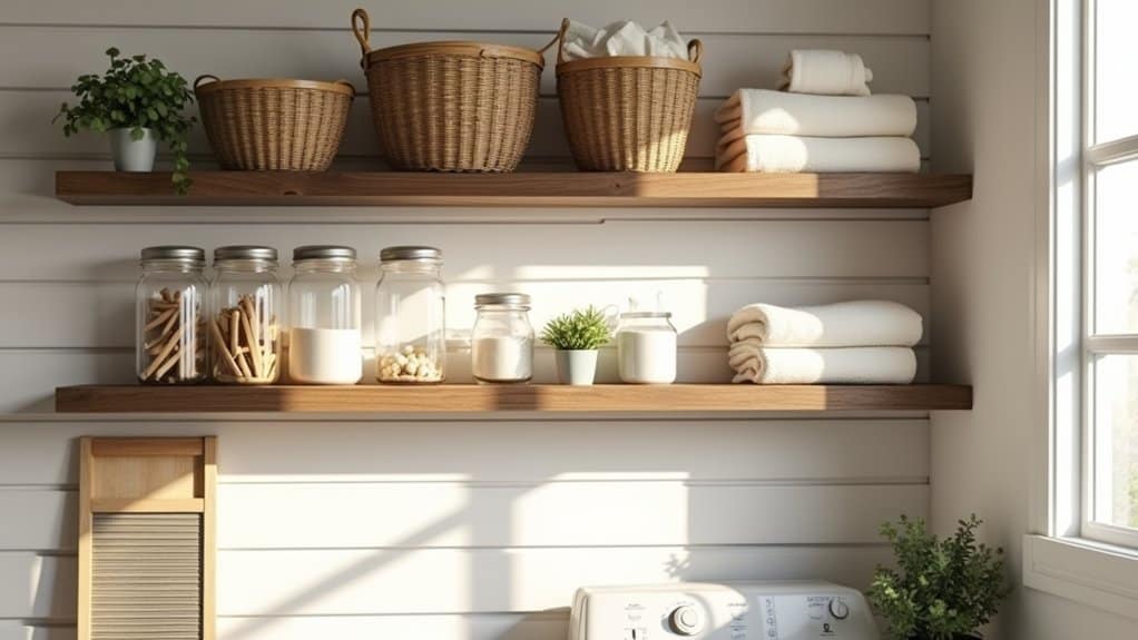 Rustic wooden shelves can add both charm and functionality to your laundry room, providing a stylish way to store and organize essentials. Start by mounting the shelves on a wall near your washer and dryer for easy access to frequently used items like detergent, dryer sheets, and fabric softener. Make certain the shelves are securely anchored to support the weight of heavier items, and consider spacing them at varying heights to accommodate taller bottles or baskets.