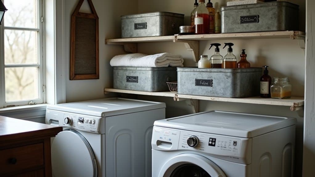 Antique jars can be both a functional and charming addition to your laundry room organization. Use these glass or ceramic containers to store laundry essentials like detergent pods, dryer sheets, or clothespins, keeping them easily accessible yet neatly contained. Label each jar with tags or stickers to guarantee you can quickly identify contents, enhancing both practicality and the vintage aesthetic.