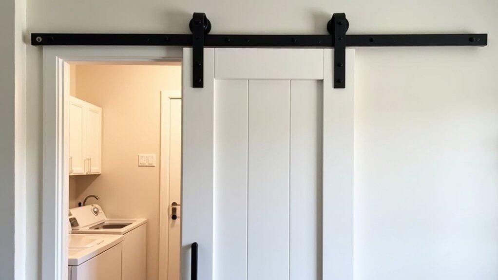 Installing a barn door as a laundry room closure is an excellent way to save space while adding a stylish, rustic touch to your home. Unlike traditional swinging doors, barn doors slide along a track, making them ideal for tight spaces where a door swing might be obstructed by appliances or cabinets. To organize this setup effectively, choose a barn door that complements your laundry room’s decor and guarantee the track is mounted securely to support the door’s weight over time.