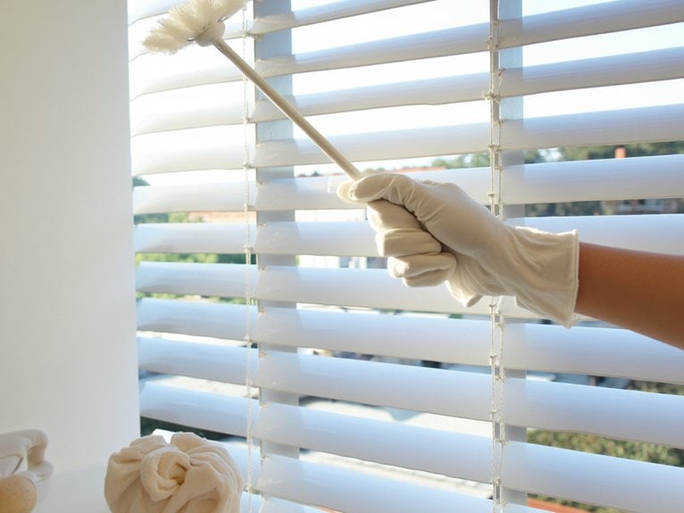 While fabric blinds benefit from vacuuming, wood blinds need a more specialized approach to preserve their natural beauty. For ideal wood blind durability, experts recommend starting with a thorough dry cleaning using a microfiber cloth or Swiffer Duster.
