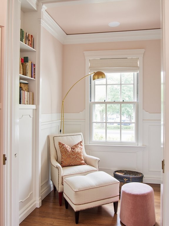 The nook’s functionality comes from carefully chosen accessories: a matching tufted ottoman for leg support, an adjustable floor lamp delivering optimal illumination, and a convenient side table for essentials. Soft throw blankets and pastel accent pillows complete the space with layers of comfort and style.