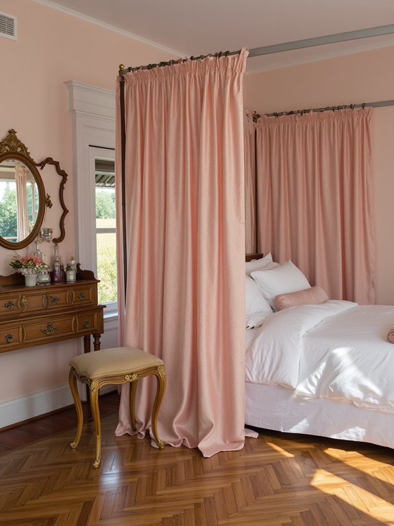 A satin-draped dressing screen combines functionality and elegance in bedroom design, offering privacy for changing clothes while serving as a sophisticated decorative element. The screen features luxurious satin fabric panels in soft champagne or blush tones, mounted on a carved wooden frame with vintage details.