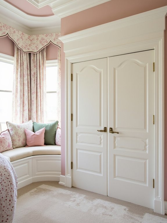 Scalloped trim details bring elegant feminine charm to a master suite through thoughtfully placed architectural elements. From crown molding with 4-6 inch scalloped patterns to coordinating bedding with delicate 2-inch borders, these curved details create visual flow throughout the space.