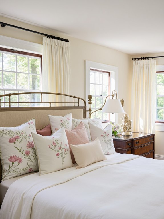 The key to a successful embroidered pillow arrangement lies in balancing traditional and contemporary patterns while maintaining a unified color scheme. Different textile weights and embroidery styles contribute to visual depth, transforming the bed into a sophisticated focal point that enhances the room’s overall ambiance.