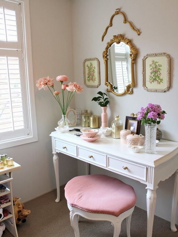 The corner features a cushioned floral stool, an ornate mirror with gentle lighting, and delicate decorative touches. Dried rose arrangements, botanical prints, and crystal accents add elegance while maintaining functionality for daily beauty routines.