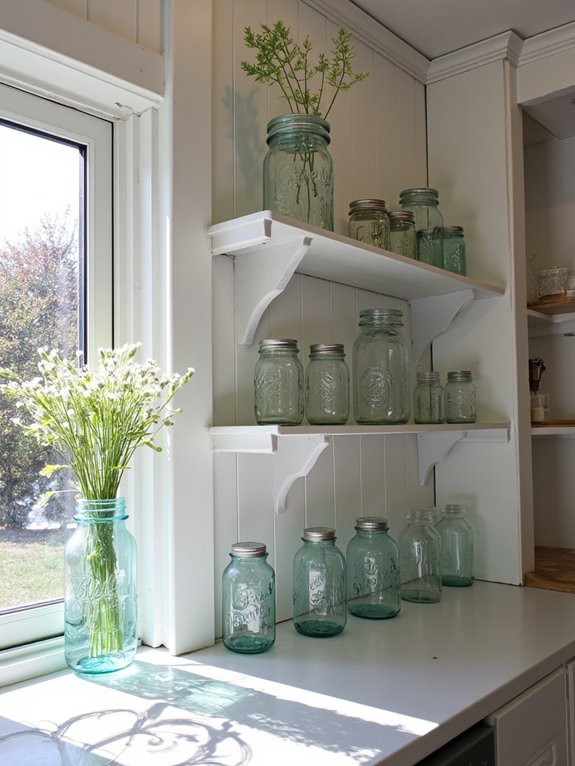 Glass mason jars provide both practical storage and decorative appeal in the kitchen. Their classic design and transparency make them ideal for displaying dry goods, utensils, and fresh flowers while keeping items organized and easily accessible.